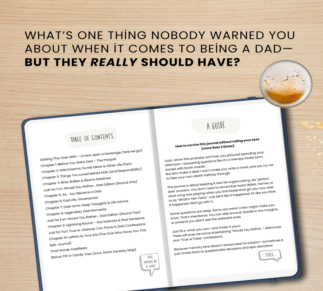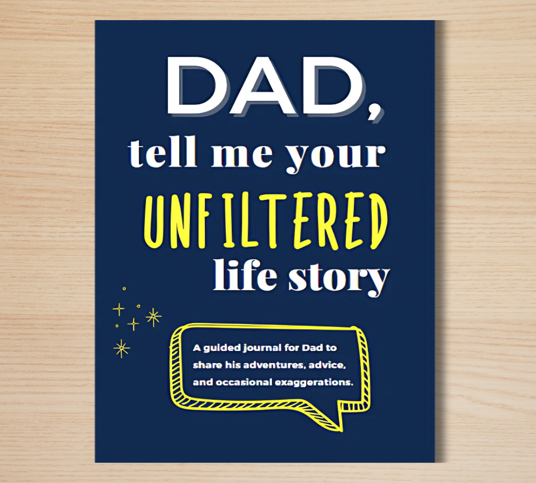 Dad, Tell Me Your UNFILTERED Life Story is a guided journal with 250 laugh-out-loud and unexpectedly heartfelt prompts to help Dad share his real-life stories—no sugarcoating necessary (unless he insists).