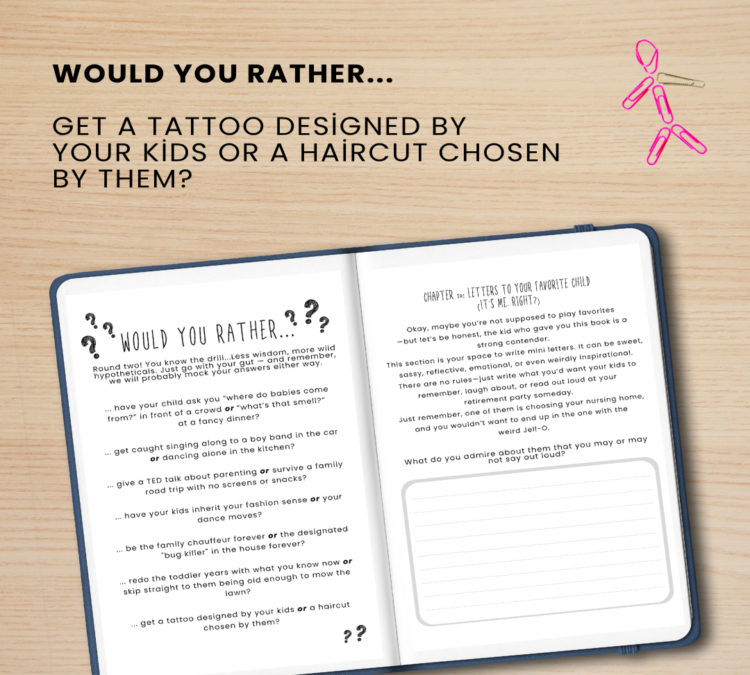 ✔ Bonus sections: Would You Rather..."change a diaper on a moving airplane, or teach your teen to parallel park?"